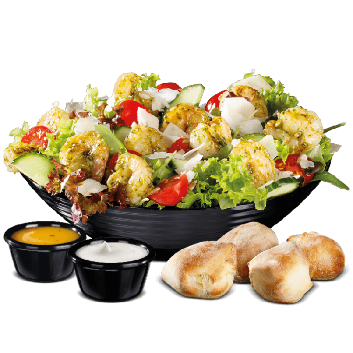 mit hauseigener Salatmischung, gebratenen Black Tiger Garnelen in Basilikumpesto, frischen Kirschtomaten und Gurken, Körnermischung, gehobeltem Grana Padano inkl. 1x Dressing nach Wahl & 4 Salatbrötchen