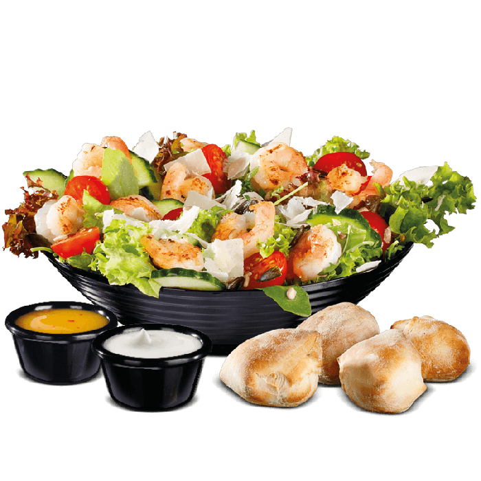 mit hauseigener Salatmischung, natur gebratene Black Tiger Garnelen, frischen Kirschtomaten und Gurken, Körnermischung, gehobeltem Grana Padano inkl. 1x Dressing nach Wahl & 4 Salatbrötchen