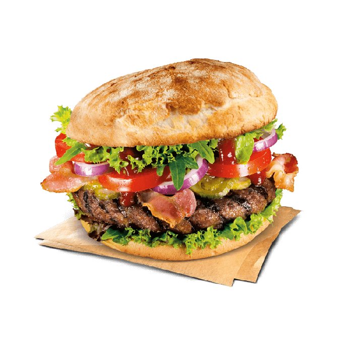 mit rustikalem Burgerbrötchen, Rindfleisch, Bacon, Zwiebeln, Tomaten, Sandwichgurken, Salat & BBQ-Sauce Classic-Burger: 1x150g Beef, Double-Burger: 2x150g Beef