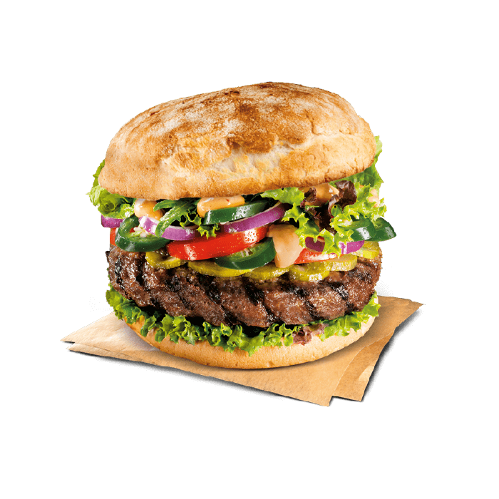mit rustikalem Burgerbrötchen, Rindfleisch, Zwiebeln, Tomaten, Jalapenos, Salat, Chipotle Southwest-Sauce & Spezialsauce. Classic-Burger: 1x150g Beef, Double-Burger: 2x150g Beef