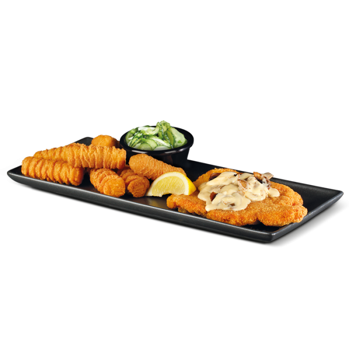 Knuspriges Meister-Schnitzel an Champignongs in schmackhafter Rahmsauce mit einer Portion Kroketten und leckerem Gurkensalat