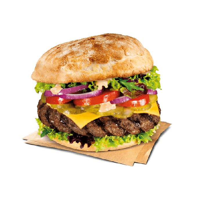 mit rustikalem Burgerbrötchen, Rindfleisch, Zwiebeln, Tomaten, Sandwichgurken, Salat, Cheddar-Käse & Spezialsauce. Classic-Burger: 1x150g Beef, Double-Burger: 2x150g Beef