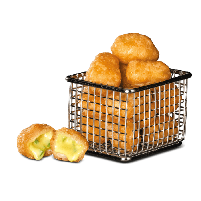 12 Nuggets aus extra cremigem Käse und feinen Paprika- und Jalapeño-Stückchen in knusprigem Teigmantel
