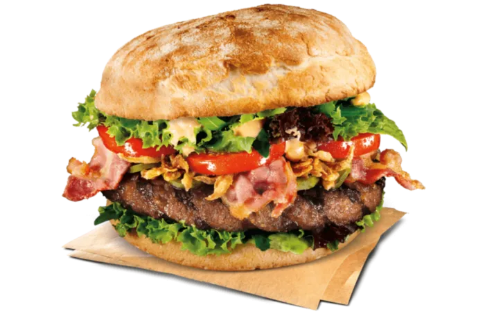 (BurgerbrötchenA, A1 RindfleischJ, Bacon2, 3, 8, Sandwichgurken2, 9, RöstzwiebelnA , Spezialsauce1, 2, C, J)