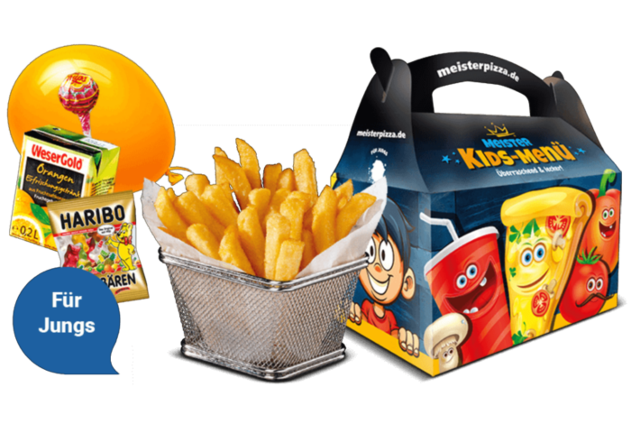 mit einer Portion Crunchy Fries mit einem Dip nach Wahl, 1x Orangen-Erfrischungsgetränk (0,2l) und einer großen Überraschungsbox mit Spielzeug, Gummibärchen & Frucht-Lutscher.