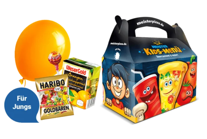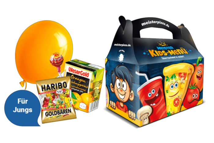 Kids Box mit 1x Orangen-Erfrischungsgetränk (0,2l) und einer großen Überraschungsbox mit Spielzeug, Gummibärchen & Frucht-Lutscher.