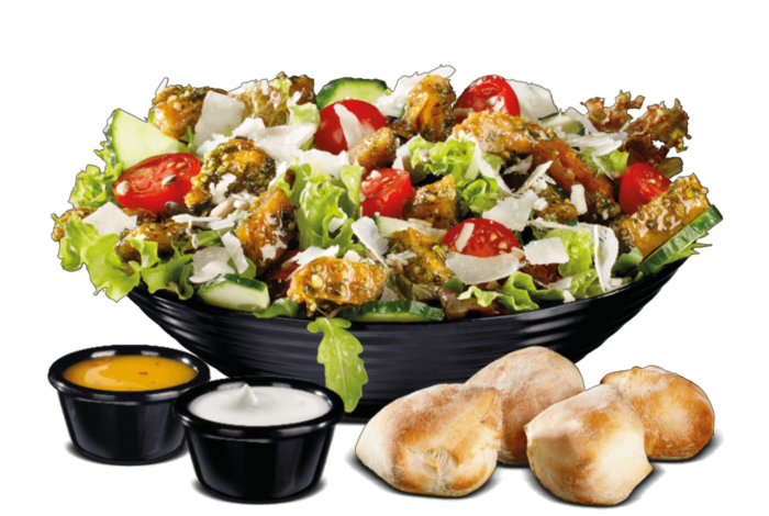 (Grana PadanoG, Soyastreifen nach Hähnchen Art in BasilikumpestoE,F,H, Körnermischung bestehend aus: Pinien-, Sonnenblumen-. und Kürbiskernen, Salatbrötchen A,A1)