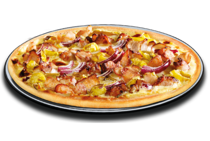 mit frischem Pizzateig, Sauce Hollandaise, Hähnchenkebab, milden Peperoni, roten Zwiebeln & leckerem Gouda-Käse