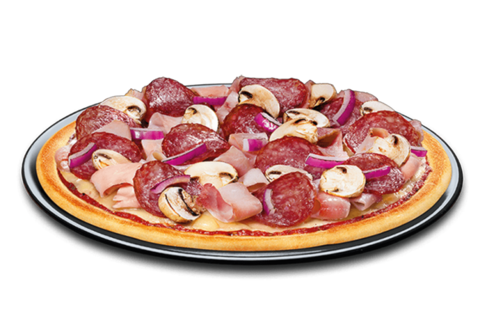mit frischem Pizzateig, Tomatensauce, Hinterkochschinken, Salami, Champignons, Zwiebeln & leckerem Gouda-Käse
