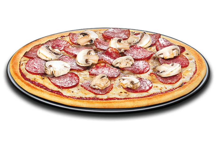 mit frischem Pizzateig, Tomatensauce, Salami, Champignons