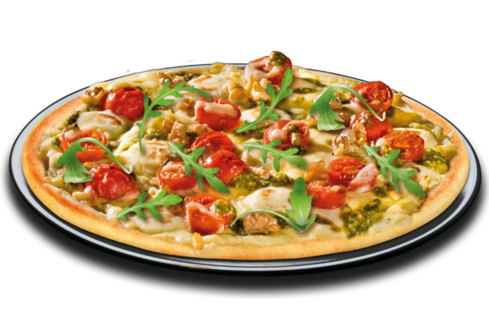 (PizzateigA, A1, frische Pestocreme10, C, G, H4, Sojastreifen nach Hähnchen ArtF, Walnüsse H3, MozzarellaG, Gouda-KäseG)