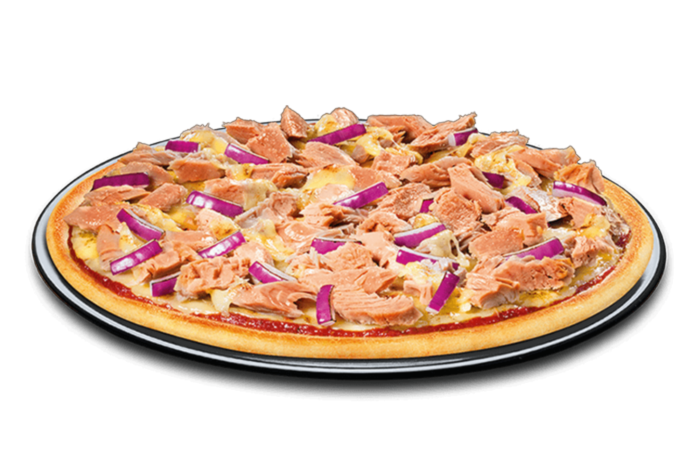 mit frischem Pizzateig, Tomatensauce, Thunfisch, Zwiebeln & leckerem Gouda-Käse