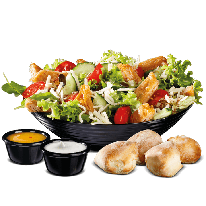 mit hauseigener Salatmischung, Soyastreifen nach Hähnchen Art, frischen Kirschtomaten und Gurken, Körnermischung, gehobeltem Simply V Reibeschmelz & inkl. 1x Dressing & 4 Salatbrötchen