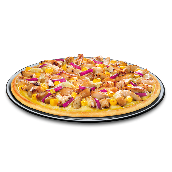 Frischer Pizzateig mit veganer Currysauce, Sojastreifen nach Hühnchen Art, Mais, Zwiebeln, veganer Pizzaschmelz (Simply V)