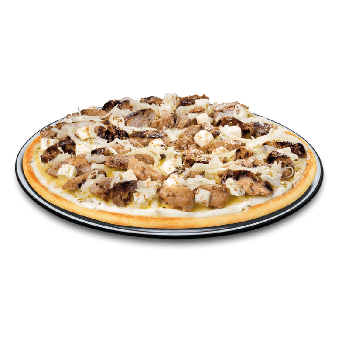mit frischem Pizzateig, Gyros-Fleisch, Krautsalat, Hirtenkäse,