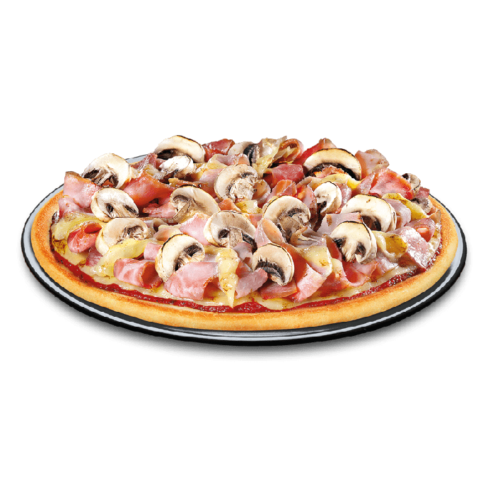 mit frischem Pizzateig, Tomatensauce, Hinterkochschinken, Champignons