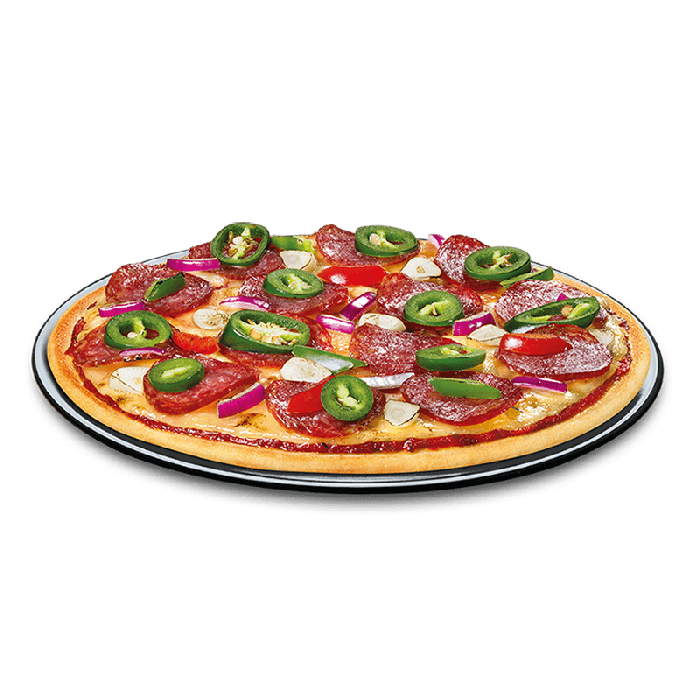 mit frischem Pizzateig, Tomatensauce, Peperoni Salami, Paprika, Knoblauch, Zwiebeln, Jalapeños & leckerem Gouda-Käse