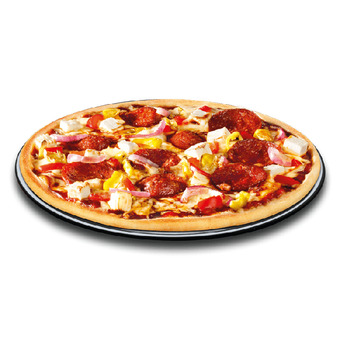 mit frischem Pizzateig, BBQ-Sauce, Paprika, Sucuk, Hirtenkäse, roten Zwiebeln, milden Peperoni & leckerem Gouda-Käse