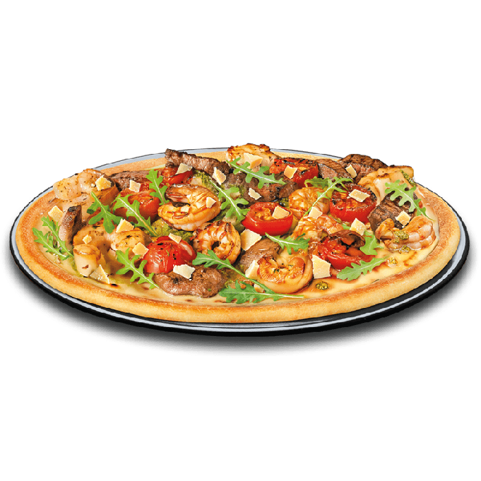 mit frischem Pizzateig, Pesto-Creme, Rindersteakstreifen, Kirschtomaten, Black Tiger Garnelen, Rucola, Grana Padano & leckerem Gouda-Käse