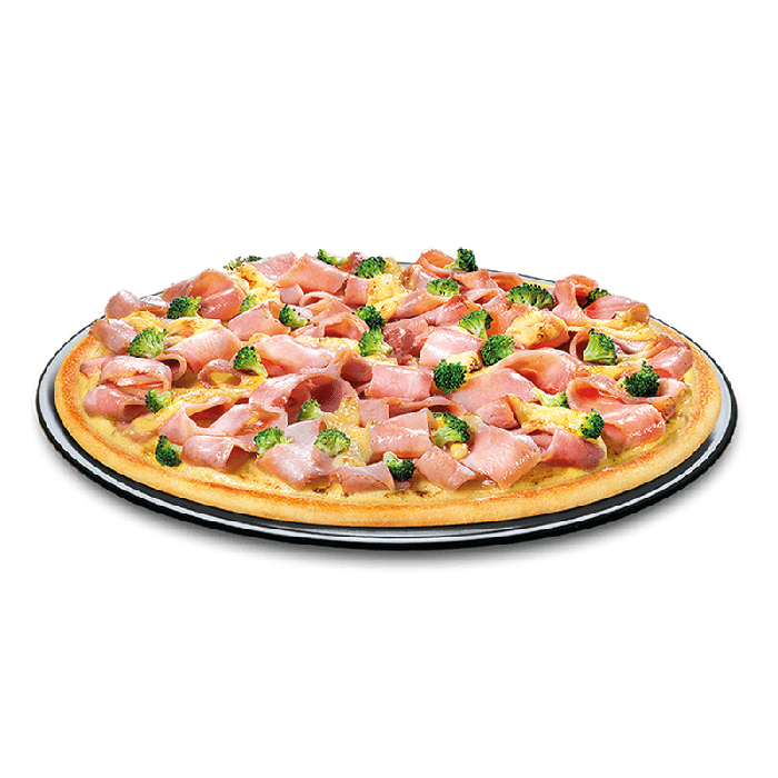 mit frischem Pizzateig, Hinterkochschinken, Brokkoli, Sauce Béarnaise & leckerem Gouda-Käse