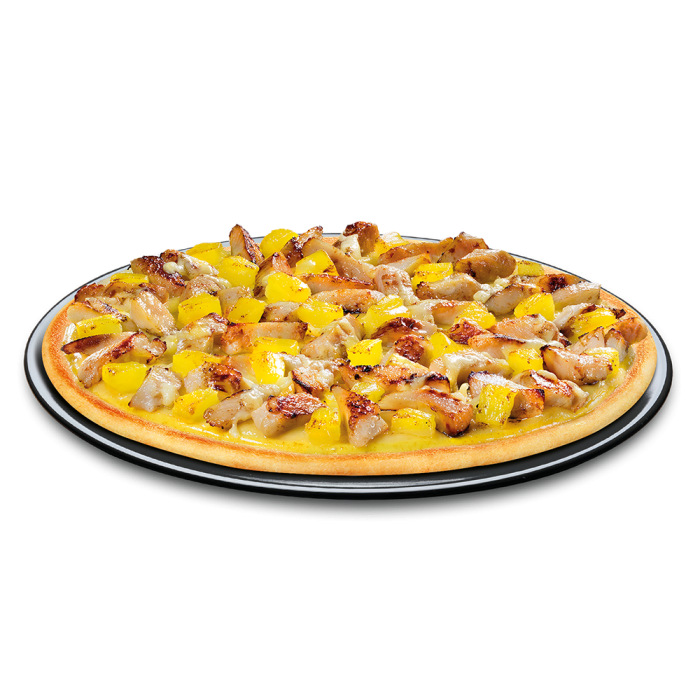 frischer Pizzateig mir veganer Currysauce, Sojastreifen nach Hühnchen Art, Ananas und veganem Reibeschmelz (Simply V)